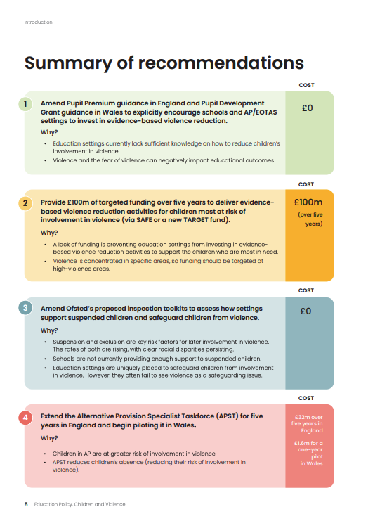 - A lack of funding is preventing education settings from investing in evidence-based violence reduction activities to support the children who are most in need.